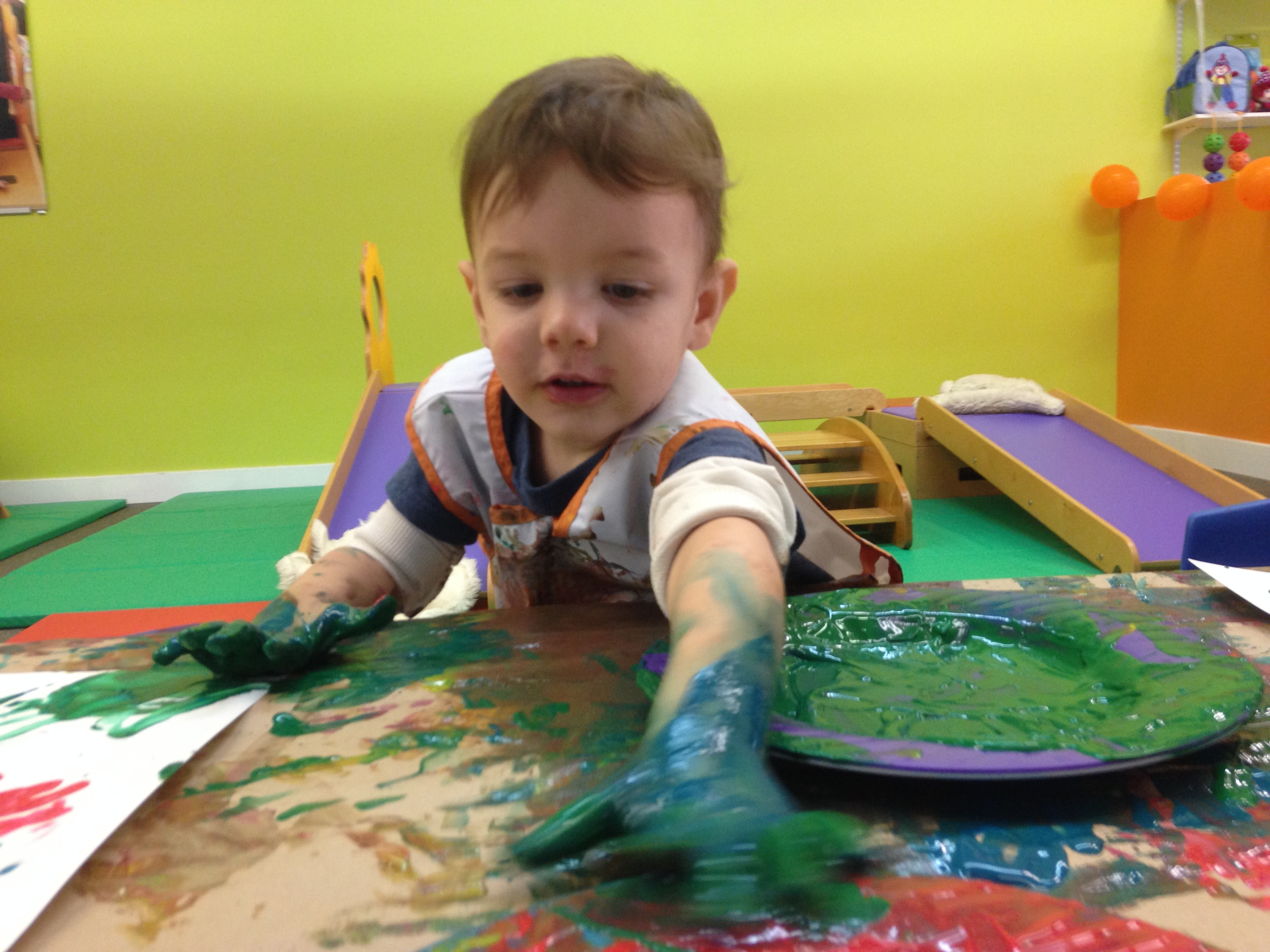 The teacher decided that she was going to start the story-time portion of the activities, so I convinced him to stay. He didn’t really want to listen to the story, so he ran around a little more (being open play at Gymboree, I was totally fine with this). Once the story ended, things got interesting. That’s when she brought out the paints. She brought four plates, each with a different color of paint. Red, yellow, blue and green. She brought smocks for the kids, and I wish I had thought about taking off his shirt (unfortunately, I didn’t, so that shirt is now his “painting shirt”).
